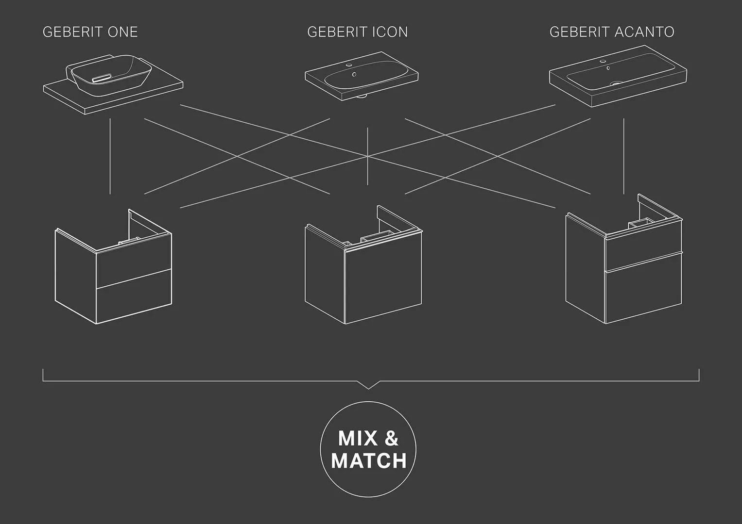 Mit Geberit ONE hat der Hersteller seit einigen Jahren eine Badserie auf dem Markt, deren Bestandteile sich so gut miteinander kombinieren lassen, dass über 2.000 verschiedene Designvarianten realisierbar sind. Dem individuellen Geschmack waren bislang aber Grenzen gesetzt. Zum Beispiel, wenn ein bestimmter Waschtisch von ONE am besten gefiel, aber Möbel mit Griffen oder Glasfronten bevorzugt wurden. Mit dem Konzept Mix & Match werden Bauform und Technik vereinheitlicht, das individuelle Design der jeweiligen Serie bleibt bestehen. So kann der Kunde Waschtische mit sämtlichen Waschtischunterschränken der Geberit Serien ONE, iCon und Acanto kombinieren.